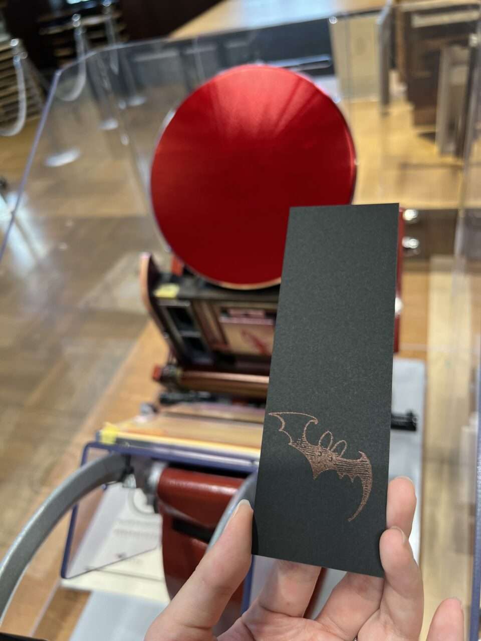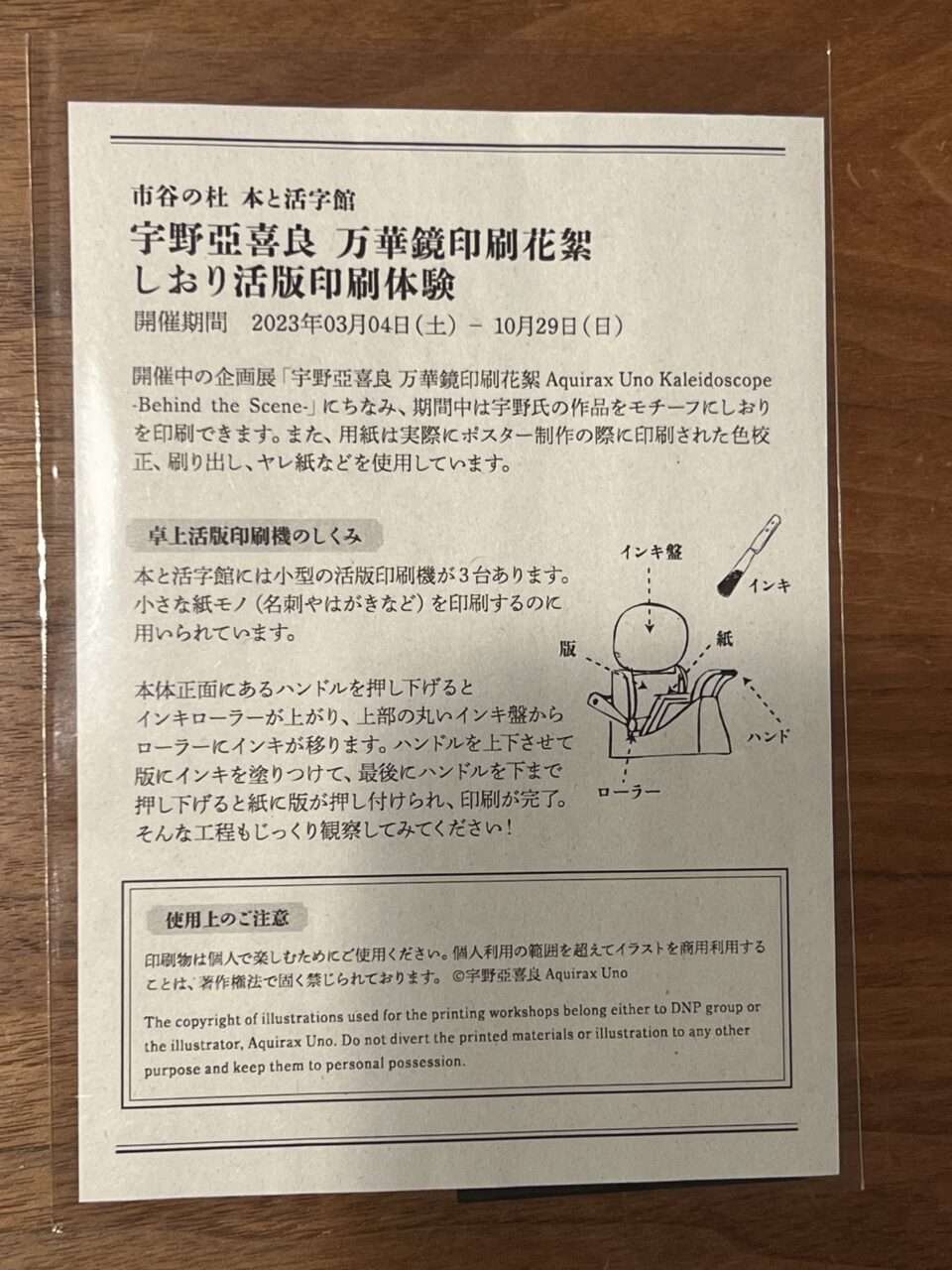 テキンと呼ばれる手法で活版印刷を体験できる.栞に使っているのは実際のポスター作成の際に印刷された色校正,刷り出しといった紙を使用されていてとても豪勢だ.