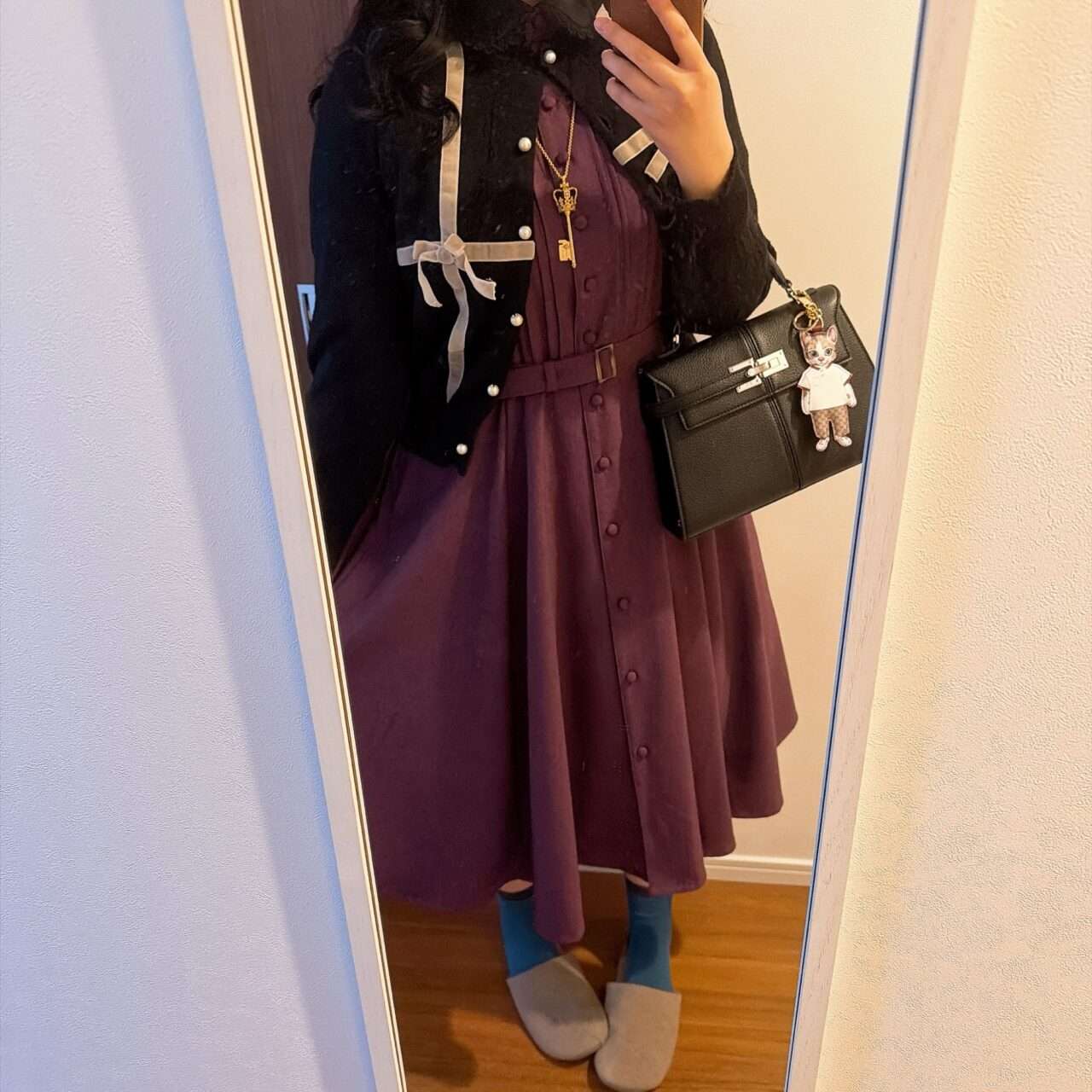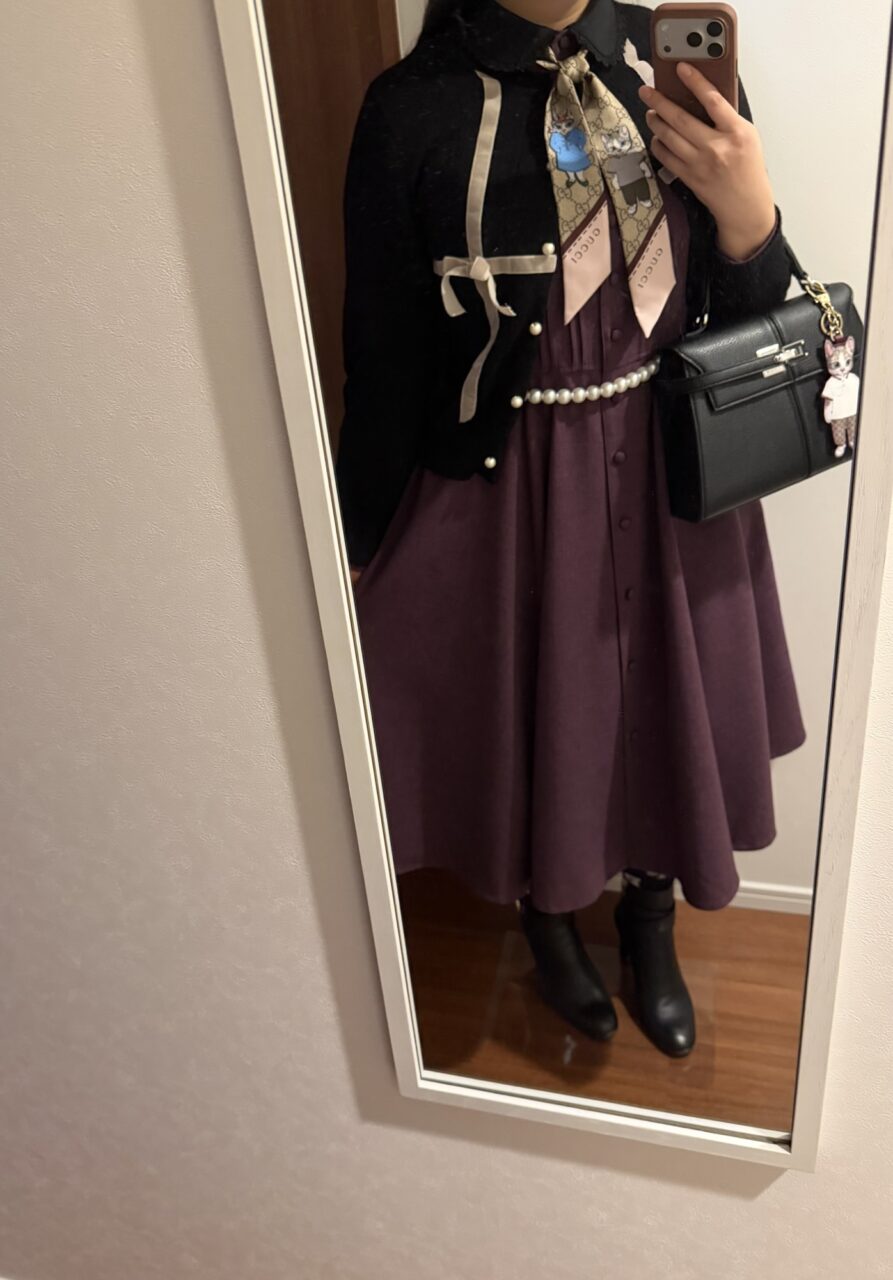 話を戻しますが「上顧客限定アイテム」は黒襟だなんですよ。紫に黒合わせたくないですか?アナスイに憧れて育った世代です。紫メタリックに蝶エンボスの財布、蝶のバックルのついたバッグ、薔薇のネックレス、黒の手鏡を持つ大学時代を過ごしましたからね。王道アナスイ配色、絶対好き…というのがどハマりした経緯です。(もちろんグレー襟合わせも可愛い)