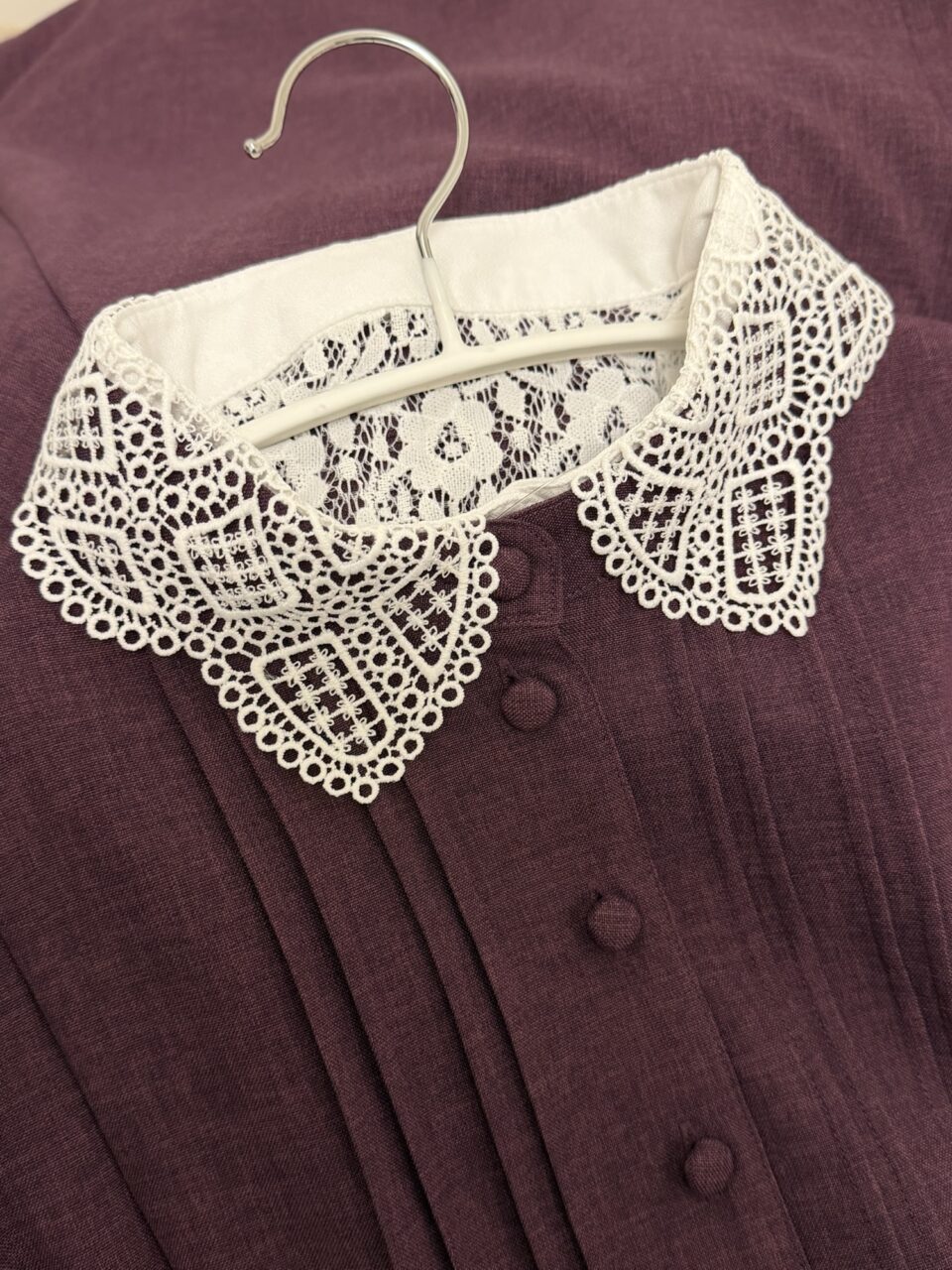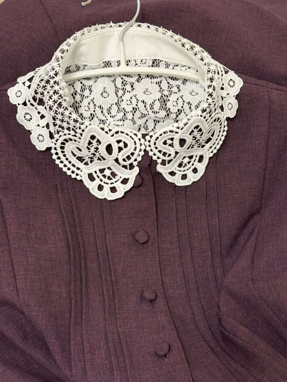 Belette 民の皆様の着画を見るたびに(白襟買っておけばよかったかも〜)という思いが募り、レースならエレガント系でいけるかも!と思いたった襟元コーデ。カーディガンをグレーにしようかなと妄想中…。